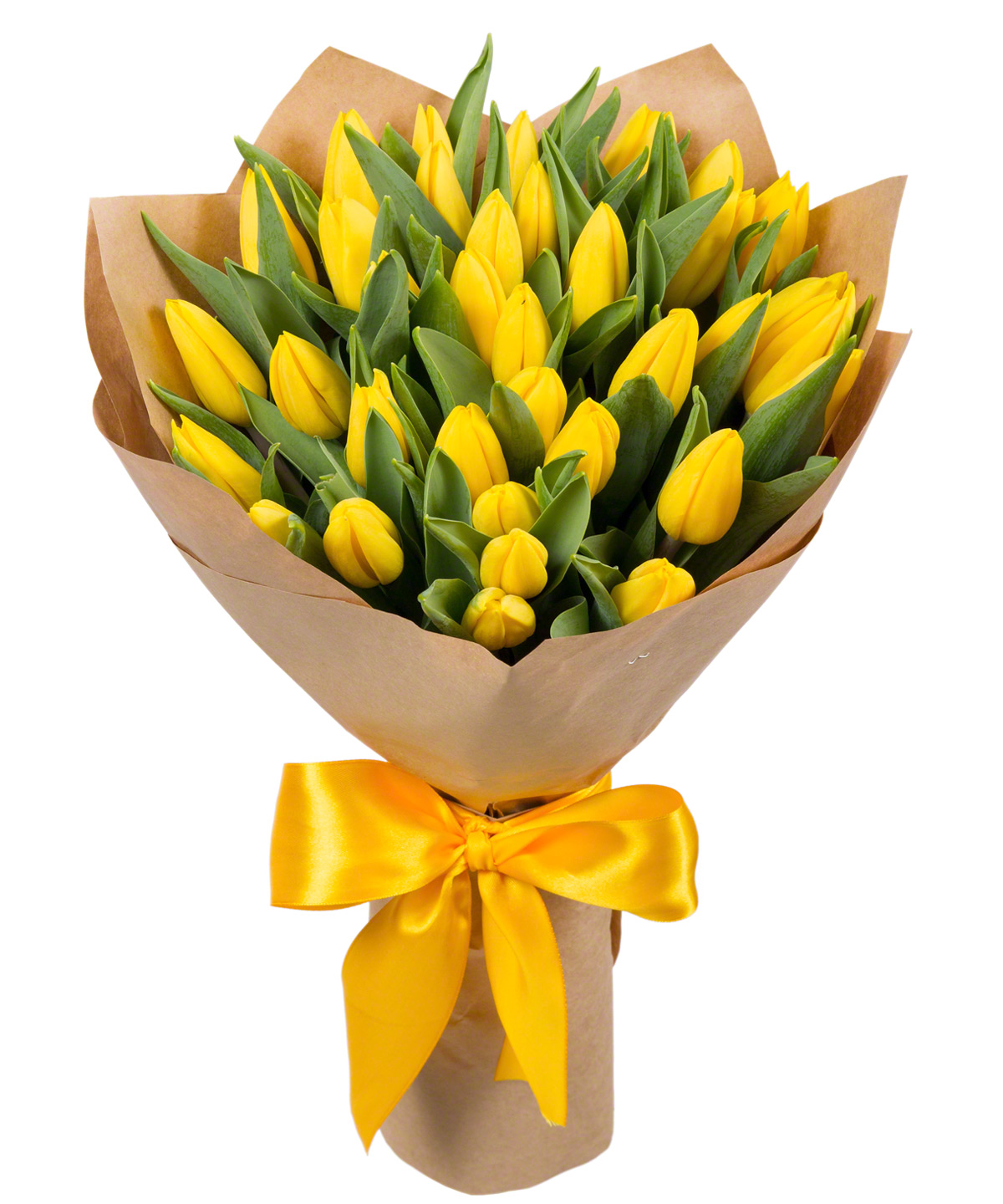 Букет состоит из 35 желтых тюльпанов, крафт, желтая лента.