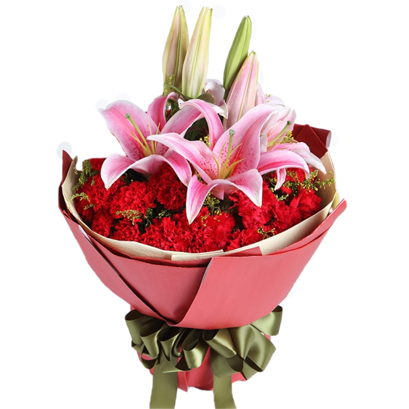 Букет состоит из 27 красных гвоздик, 3 лилии, зелень, красивая упаковка, атласная лента.