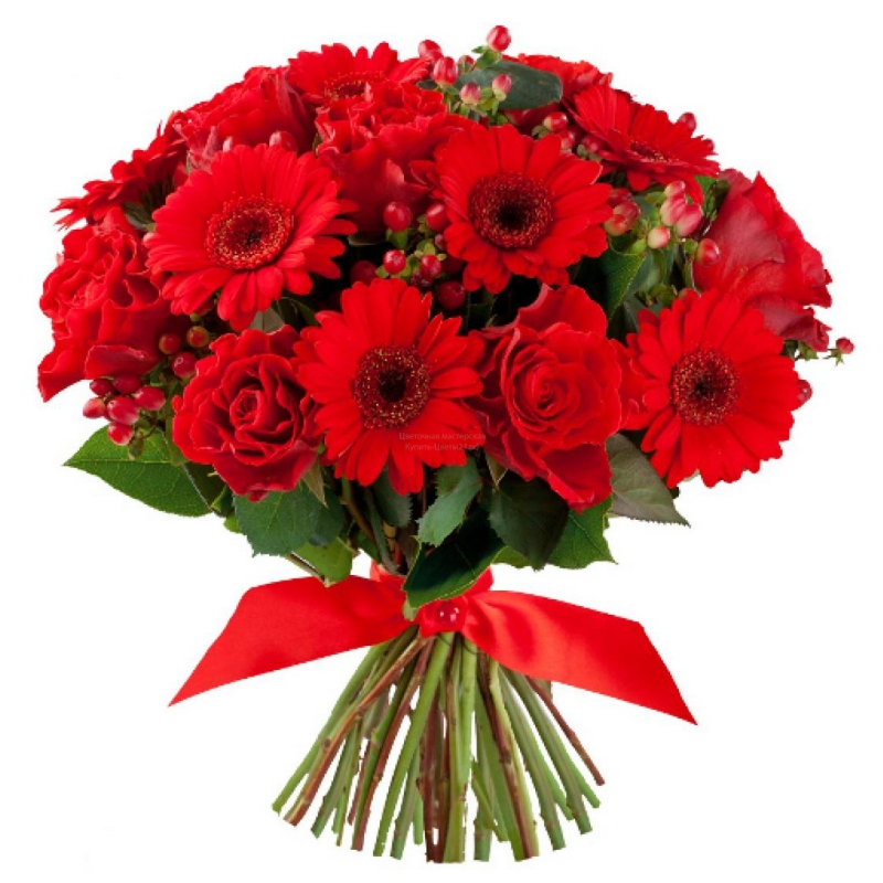 Букет состоит из 11 красных роз, 8 красных гербер, 4 ветки гиперикума, прозрачная упаковка, красная лента.