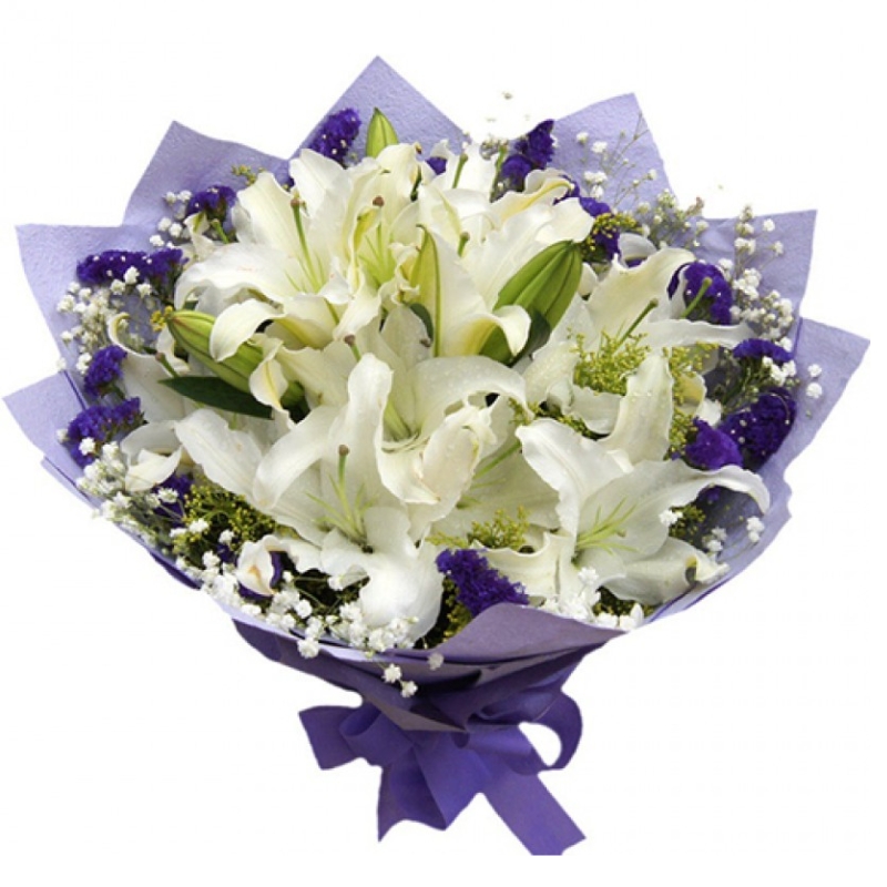 Букет состоит из 13 красных роз, 7 веток белых лилий, красивая упаковка, атласная лента.