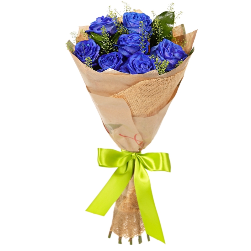 Букет состоит из 7 синих роз, зелень, крафт, атласная лента.