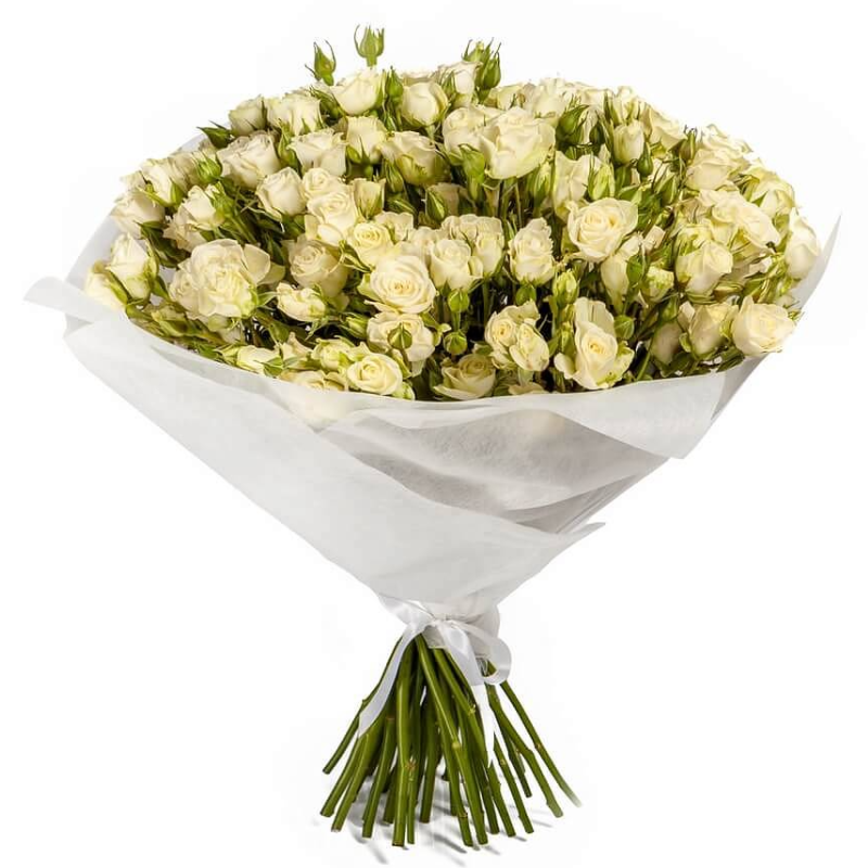 Букет состоит из 31 белая кустовая роза, фетр, атласная лента.