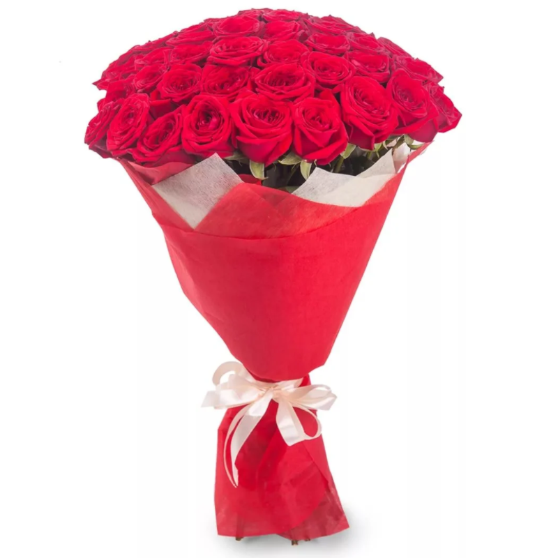 Букет состоит из 35 красных роз, красивая упаковка, атласная лента.